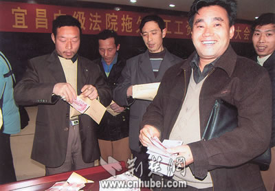 2004年12月22日,民工在宜昌中級法院領取執(zhí)行回的工錢。