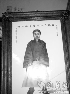 昨日,記者在湖北省社會(huì)科學(xué)院劉女士家中,見到了這塊漢繪瓷板畫。白色的瓷板鑲嵌在木制相框中,瓷板畫中間是一幅手工繪就的人像,畫中老人正襟危坐,含威不露,瓷板上端是“父親大人七旬晉四紀(jì)念”,右批為“民國(guó)二十七年孟春”,左批“男惟明制于漢口抗日軍次”,下端有“漢口榮康瓷業(yè)公司精繪”的小字(如圖)。