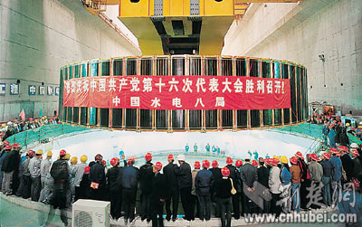今年8月1日,三峽左岸電廠的最后一臺(tái)發(fā)電機(jī)組轉(zhuǎn)子吊入機(jī)坑(圖二)。令三峽建設(shè)者們感到自豪的是,這同樣是世界上最大的發(fā)電機(jī)組,不同的是其零部件國產(chǎn)化程度達(dá)到85%。
