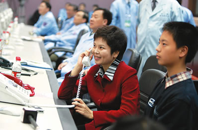 12日21時34分,正在神舟六號飛船返回艙內(nèi)的航天員費(fèi)俊龍和聶海勝與北京航天飛控中心指控大廳內(nèi)的家人進(jìn)行天地通話。