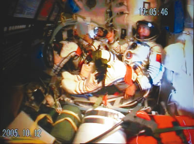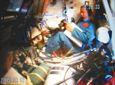 17時29分,航天員向地面飛控中心報告飛船工作正常,已做好開啟返回艙艙門的準(zhǔn)備。在得到地面指揮員的指令后,費(fèi)俊龍打開返回艙艙門,在聶海勝的幫助下進(jìn)入軌道艙工作。
