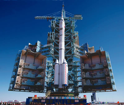 長征二號F型火箭等待著它的第6次飛行。兩小時45分鐘前,執(zhí)行神舟六號載人航天飛行任務(wù)的航天員費(fèi)俊龍和聶海勝進(jìn)入飛船返回艙,“神箭”和“神舟”第一次迎來了兩名乘客。