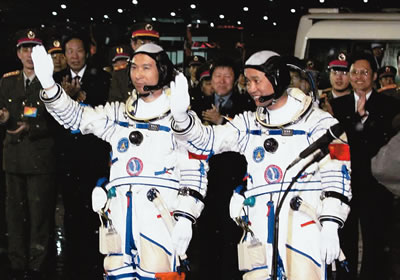12日9時整,航天員費(fèi)俊龍、聶海勝駛乘神舟六號載人飛船飛向太空,開始了中國人首次雙人太空多日行。