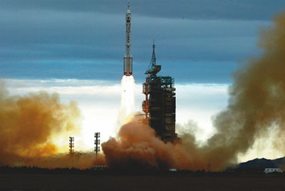 9時整,費(fèi)俊龍、聶海勝乘坐神舟六號飛船在長征火箭的托舉下,飛向太空。