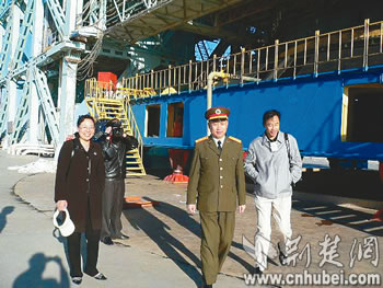 發(fā)射完畢后,酒泉衛(wèi)星發(fā)射中心參謀長吳年生帶領湖北老鄉(xiāng)參觀發(fā)射架。本報通訊員李福元攝