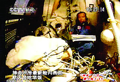 聶海勝正在進(jìn)行“穿艙”———從返回艙進(jìn)入軌道艙。