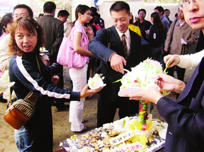 這個(gè)匠心獨(dú)運(yùn)的蛋糕由妞妞公司制作贈(zèng)送。其主體部分是一條飛龍,并書有“飛龍?jiān)谔臁弊謽印ow龍一側(cè),則是一只“神舟六號(hào)”航天飛船模型。