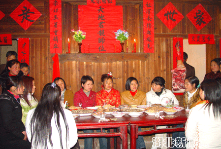 今年1月,該縣文化部門在采花鄉(xiāng)找到完整的“唐祭儀式”藝人班子。十幾名藝人雖然在解放后都沒有再進行過“告祖”儀式,但整個程序記得十分清楚。經(jīng)協(xié)商策劃,決定利用男女雙方實景把“告祖”及土家婚俗完整真實拍攝下來。3月28日,市縣兩級文化工作專班和十六名民間藝人開赴傅家堰火山村,日夜奮戰(zhàn)4天,終于把“告祖”的整個程序以寫實手法拍攝下來。同時,還拍攝到了土家婚俗中背新娘、吃雞蛋茶、抬花轎、陪十弟兄、陪十姊妹的珍貴鏡頭,把土家婚俗完整記錄了下來,為項目的申報工作進一步夯實了基礎。