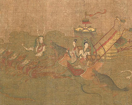 此圖是根據(jù)三國(guó)(220--265年)魏人曹植所寫《洛神賦》而創(chuàng)作的故事畫(huà)。畫(huà)面開(kāi)首描繪曹植在洛水河邊與洛水女神瞬間相逢的情景,曹植步履趨前,遠(yuǎn)望龍鴻飛舞,一位“肩若削成,腰如約素”、“云髻峨峨,修眉聯(lián)娟”的洛水女神飄飄而來(lái),而又時(shí)隱時(shí)現(xiàn),忽往忽來(lái)。后段畫(huà)洛神駕六龍?jiān)栖囯x去,玉鸞、文魚(yú)、鯨鯢等相伴左右,洛神回首張望,依依不舍,一種無(wú)奈離析之情顯現(xiàn)畫(huà)面。