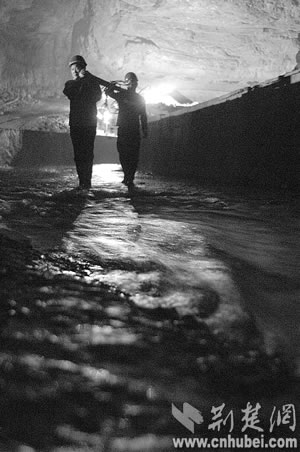 寂寞的蝙蝠第一次接待了人間來客,沉睡萬年的巖溶洞穴第一次迎來了觀者。但黑暗陌生的世界還是讓堂堂男兒們感覺了一絲陰森恐怖。他們曾聽當地百姓傳說,洞里有巨蟒,所以至今沒人敢進洞!白ゾo時間測量!”來不及恐懼,他們?yōu)樽约汗膭,因為這里隨時可能發(fā)生漲水、墜落等危險。可惜,第一次經驗不足,手電筒的電池很快用完了,一行人只得互相攙扶著,摸索出溶洞。“后來,我們又進去了7次,終于測出了暗河的具體位置和流向!狈轿奈湔f。