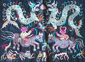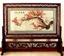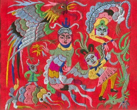 苗繡 刺繡,是苗族婦女盛裝不可或缺的飾物,主要有領(lǐng)花、肩花、襟花、背塊花、袖口花、裙鑲花、帽頂花、帽頂花等品種。苗族刺繡,整體上多為幾何構(gòu)圖,古樸多姿。其圖案因繡片條、塊的不同,分為幾何二方連續(xù)式和四方連續(xù)式構(gòu)圖。其圖案取材于生活中常見的草木、鳥獸、蟲魚、器具等。圖案的整體布局一般以菱形為立體紋樣,常見的是大菱形中套小菱形,小菱形又分別由不同色彩的方、圓、三角點(diǎn)狀組成。條狀繡片,多用點(diǎn)、線或線面組合,一整二剖構(gòu)圖。繡片是按布的經(jīng)緯戳針,故曲線多折角。大塊繡片,如背塊花等,多用菱形四方連續(xù)構(gòu)圖,并在其中布以對稱的變形幾何點(diǎn)及其他折線。所有繡片,粗看五彩斑斕,細(xì)觀則不同色線組圖分明,交錯重疊,既復(fù)雜多變又結(jié)構(gòu)嚴(yán)謹(jǐn)、條理清晰。繡法很多,有平繡、凸繡、辮繡、堆花、縐繡、纏繡、挑繡、抽花等。平繡是最曾遍的繡法。這種繡法是重于圖案布局的美觀勻稱,色調(diào)鮮明,有明顯的物象感。凸繡流行于凱里、臺江部分地區(qū),它是在底布上多鋪幾層紙花,使所繡圖案凸出,有立體感。辮繡只在雷公山巴拉河一帶流行,其方法是將若干根色線編成辮子,按設(shè)計(jì)圖案平鋪于底布上,用絲線釘牢即成。圖案色調(diào)大致是青年女子鮮艷,中年以上婦女稍渾暗。如凱里、黃平、施秉等地,姑娘及較年輕婦女的盛裝刺繡以青布作底,繡大紅,間有少量白黃綠之色,亮麗醒目;中年以上婦女盛裝刺繡,亦以青布作底,以紫藍(lán)為基調(diào),間以少許桔紅、綠、白等色,顯得深沉穩(wěn)重。 京繡 京繡又稱宮繡,明清時期開始大為興盛,多用于宮廷裝飾、服飾,用料講究、技術(shù)精湛、格調(diào)風(fēng)雅,民間高檔的宮繡大都與皇宮有著千絲萬縷的聯(lián)系。京繡屬手工刺繡,所以在今天機(jī)繡發(fā)達(dá)的時候,為區(qū)別于機(jī)繡又名“手繡”。京繡在解放后,逐漸形成了自己鮮明的藝術(shù)特點(diǎn)與風(fēng)格,其選料精當(dāng)貴重,針工巧妙得體,色彩絢麗豪華,格調(diào)高雅。其中最好為針工中的“平金打籽”繡。這種繡,是以真金捻線盤成圖案,或結(jié)籽于其上,十分精致,華貴。 發(fā)繡 發(fā)繡,又稱“墨繡”。是以人的頭發(fā)為材料,在綢緞、絲絹或滌綸布上精心繡制的特種藝術(shù)品。具有淡雅、不褪色、耐腐蝕、利于收藏等特點(diǎn)。彩色發(fā)繡是相對于單色發(fā)繡而言,它是指以不同人種的天然色澤發(fā)絲為材料,遵循色彩規(guī)律,在繃平整的布帛上施針度線,塑造形象的藝術(shù)。作品的質(zhì)感效果特別好, 畫面有微妙的色彩變化,層次較單色發(fā)繡豐富,技巧靈活多變,形象更加栩栩如生。 材料的特質(zhì)屬性賦予發(fā)繡藝術(shù)獨(dú)特的魅力,具有豐富的人文內(nèi)涵,如用自己的頭發(fā)繡一幅寫真“二我”,具有生命的直接紀(jì)念意義。作品集繪畫與刺繡為一體,具有一定的美學(xué)價值和經(jīng)濟(jì)價值,又能經(jīng)久保存,千年不變,可謂收藏極品。 甌繡 由于溫州地處甌江之濱,故得名“甌繡”。400多年以前,浙江溫州地區(qū)已運(yùn)用刺繡美化服飾, 繡品技藝也達(dá)到相當(dāng)水平。據(jù)說甌繡最早產(chǎn)生于民間婦女之手,那時的刺繡品種有衣服、小兒帽 圈、圍涎、錦肚、婦女鞋面、枕頭、荷包等。題材只有花鳥魚蟲之類。甌繡真正成為供欣賞的藝 術(shù)品只有60多年歷史。1922年前后,溫州刺繡藝人林森友在上海一家刺繡莊發(fā)現(xiàn)了湘繡畫片, 回來后開辦了“美艷”刺繡作坊,仿照湘繡畫片的技法,改進(jìn)甌繡生產(chǎn)。從此,溫州出現(xiàn)了甌繡畫片。