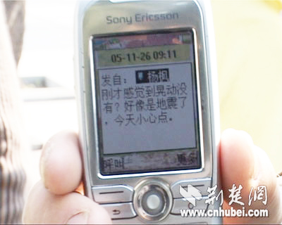 用戶:ymcbz 今天上午8時45分左右,我們還以為起了大風……有的人已經(jīng)跑到樓下:是不是有地震? 五樓的小涂說:太陽能水管在擺動……前樓的小王說:窗簾斜擺,風鈴發(fā)聲! 家里魚缸的水晃出來了! 縣檢察院正在開會,桌上的茶杯晃動,大家都往樓下跑。 感謝荊楚網(wǎng),快速告訴了我們事實的真相!