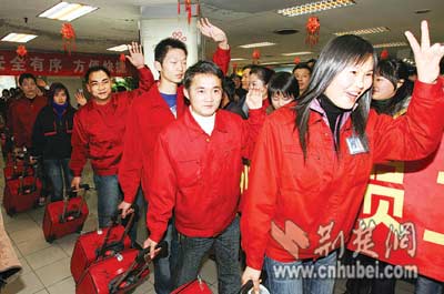 昨晚8時(shí)30分,統(tǒng)一著深紅服裝,拖著相同的紅色拉桿皮箱,89名湖北籍在浙江的農(nóng)民工微笑著走出武漢天河機(jī)場(chǎng)。