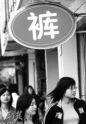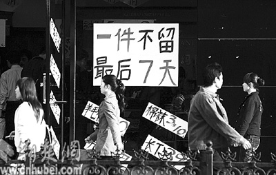 昨日,武漢市江漢路某品牌商店用碩大的“褲”字吸引行人購買欲(圖一)。在市場競爭激烈的今天,“臉面”設(shè)計成為商家費勁腦筋追逐的重心,但也有一些商家長期打著“大甩賣”的旗號欺騙消費者,頗煞風(fēng)景(圖二)。記者 張鴻 攝