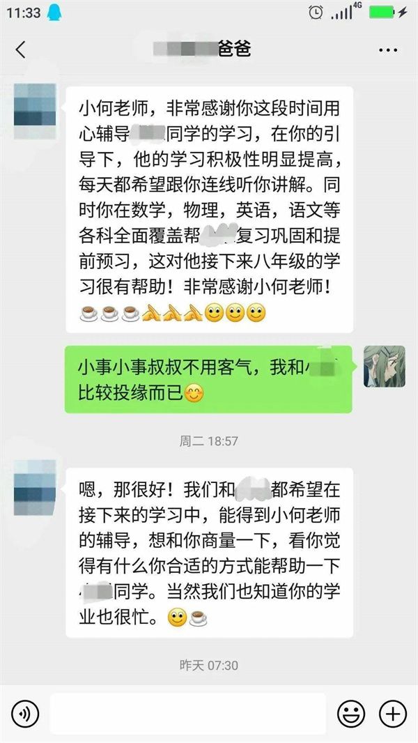 2021年的第一次線上志愿輔導(dǎo)在我的激動、欣喜、緊張交錯之中開始了。第一步也是最重要的一步:和家長進行交流與溝通。說實話,我的心里還是非常忐忑的:害怕家長不回復(fù)消息,害怕不能很好地了解小朋友的學(xué)習(xí)狀況。但其實邁出溝通的第一步之后,后面的對話就很自然了,并沒有想象中的那么困難和緊張。而且很幸運的是,家長很配合我們的輔導(dǎo)活動,我的心里瞬間就放松了不少,自信心也莫名大增!被叫老師,真是很久違的感覺,令我成就感倍增,獲得了家長的稱贊也讓我很開心。而我本身也很喜歡數(shù)學(xué),希望我的興趣可以感染到小朋友,讓她也能喜歡數(shù)學(xué)。也希望通過基本的閱讀寫作教學(xué),讓她能夠提升自己。