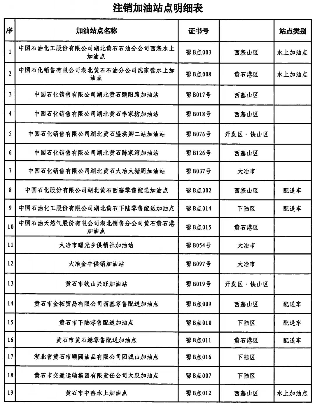 5月16日,黃石市商務(wù)局發(fā)布公告稱,注銷中國(guó)石化銷售有限公司湖北黃石頤陽(yáng)路加油站等19家加油站點(diǎn)成品油零售經(jīng)營(yíng)批準(zhǔn)證書。
