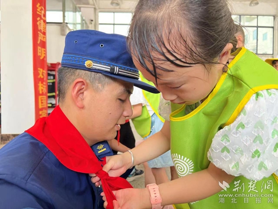 臨別之前,消防員為孩子們送上鉛筆、尺子等文具用品,孩子們依依不舍的為消防員戴上象征榮譽(yù)的紅領(lǐng)巾。