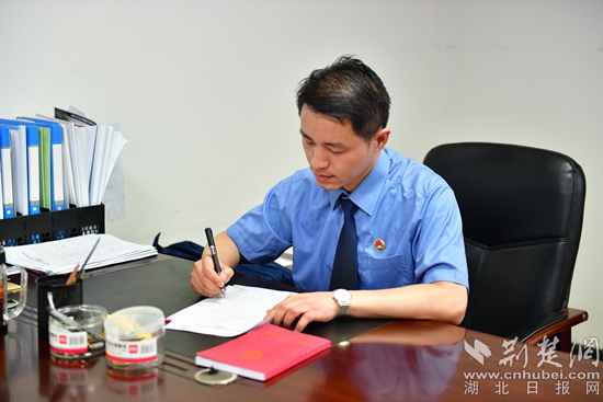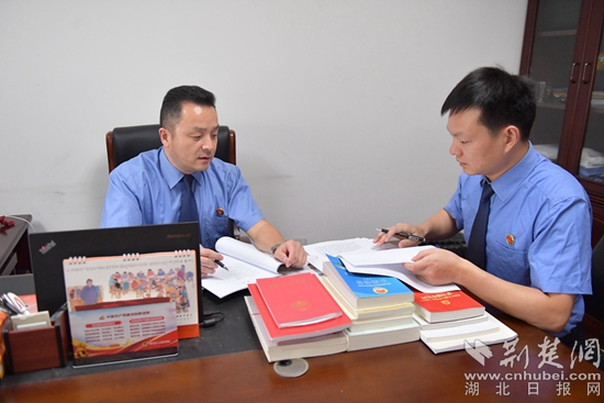 “他對待工作認(rèn)真細(xì)致?!薄八恢痹谵k案一線?!薄八俏以阂幻嬉倭⒉坏沟募t旗。”同事口中好評不斷的他,是蘄春縣檢察院第三檢察部主任袁國斌,一名退伍老兵。