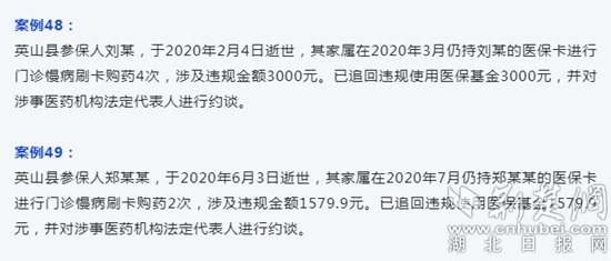 荊楚網(wǎng)(湖北日?qǐng)?bào)網(wǎng))訊(記者 金康)9月1日,英山縣醫(yī)療保障局曝光“三假”案列,49名逝世者家屬仍持死者醫(yī)??ㄟM(jìn)行門診慢病刷卡購(gòu)藥。目前,該局已全部追回違規(guī)使用醫(yī)?;穑?duì)涉事醫(yī)藥機(jī)構(gòu)法定代表人進(jìn)行約談。