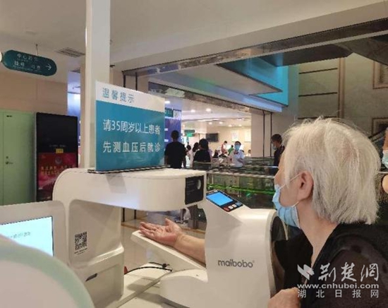 在內(nèi)科普通門診及專家門診候診區(qū),門診部給予溫馨提示:提醒35歲以上患者及時監(jiān)測血壓,可利用該設(shè)備憑掛號單或身份證進(jìn)行體溫、血壓、脈搏監(jiān)測,必要時還可以進(jìn)行身高、體重、身體質(zhì)量指數(shù)、血氧飽和度監(jiān)測。