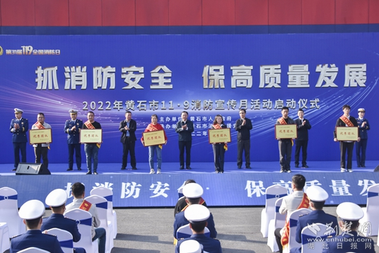 啟動(dòng)儀式上,黃石市消防救援支隊(duì)支隊(duì)長程雄鷹部署了消防宣傳月相關(guān)工作,市委宣傳部副部長丁元拾宣讀了《關(guān)于表彰全市優(yōu)秀消防志愿服務(wù)團(tuán)隊(duì)和消防宣傳志愿者的通報(bào)》,與會(huì)領(lǐng)導(dǎo)為獲獎(jiǎng)團(tuán)隊(duì)和個(gè)人代表頒發(fā)了獎(jiǎng)牌及證書。