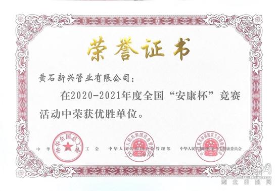 荊楚網(wǎng)(湖北日報網(wǎng))訊(通訊員 石國良 柯雪梅)近日,中華全國總工會、應急管理部、國家衛(wèi)生健康委員會聯(lián)合發(fā)文,表彰2020年-2021年度全國“安康杯”競賽活動先進集體和優(yōu)秀個人。其中,黃石新興管業(yè)被評為2020-2021年度全國“安康杯”競賽活動優(yōu)勝單位。