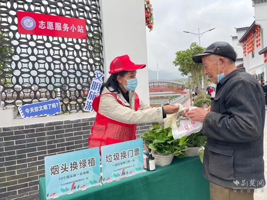 活動現(xiàn)場,大冶市新時代文明實踐中心還設置了志愿服務小站,開展“垃圾換門票”“煙頭換綠植”的文明旅游主題活動。