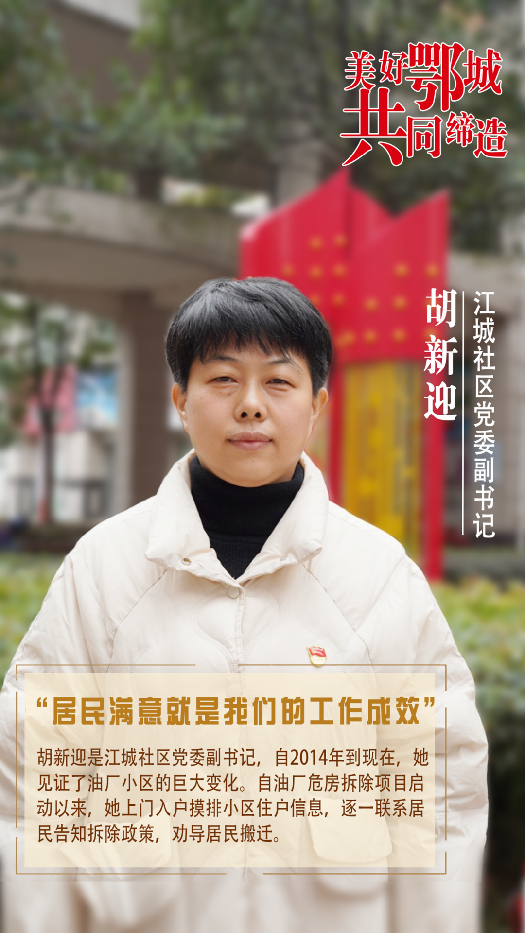 胡新迎是江城社區(qū)黨委副書記,自2014年到現(xiàn)在,她見證了油廠小區(qū)的巨大變化。自油廠危房拆除項(xiàng)目啟動(dòng)以來,她上門入戶摸排小區(qū)住戶信息,逐一聯(lián)系居民告知拆除政策,勸導(dǎo)居民搬遷。
