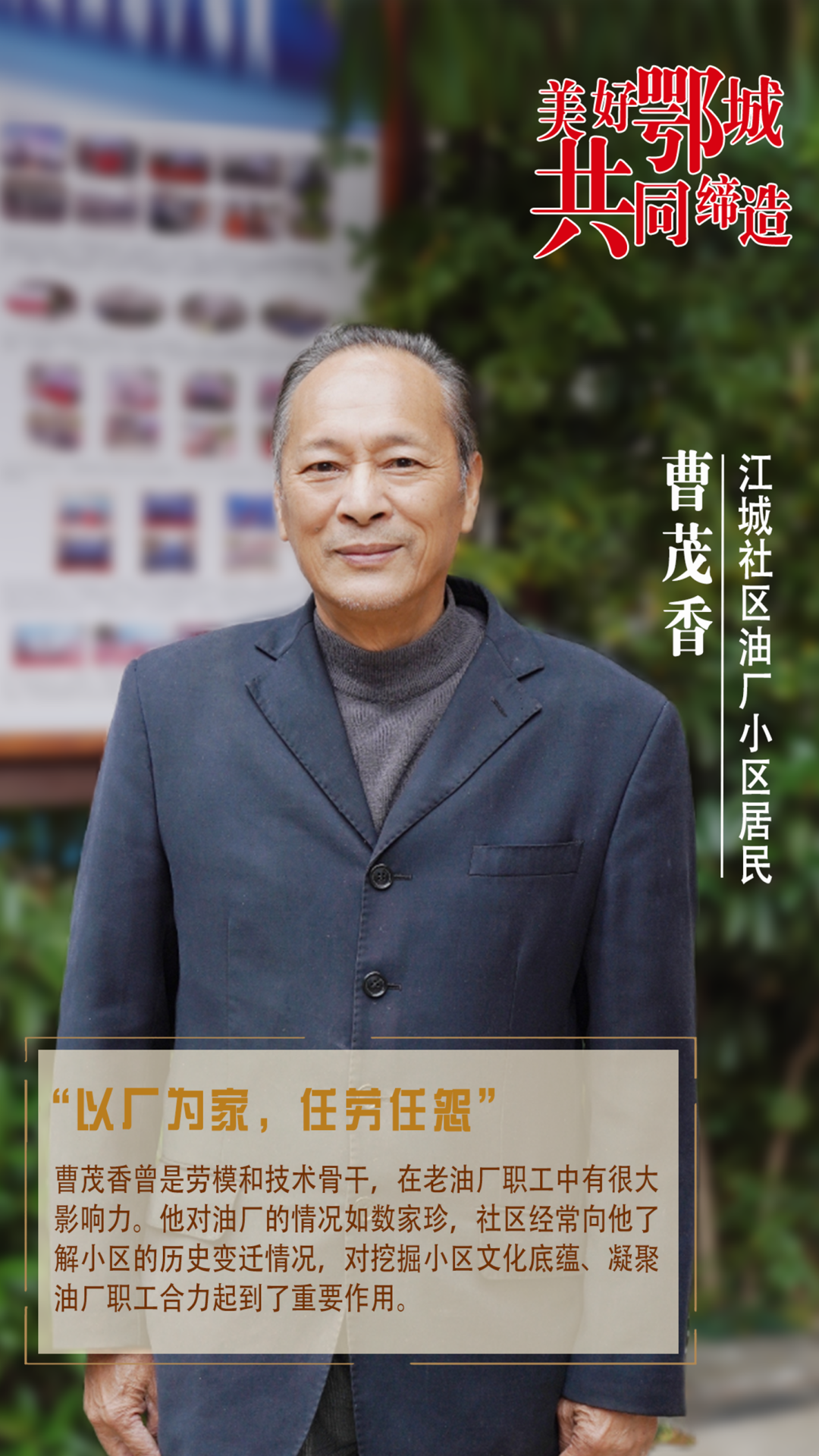 曹茂香曾是勞模和技術(shù)骨干,在老油廠職工中有很大影響力。他對(duì)油廠的情況如數(shù)家珍,社區(qū)經(jīng)常向他了解小區(qū)的歷史變遷情況,對(duì)挖掘小區(qū)文化底蘊(yùn)、凝聚油廠職工合力起到了重要作用。