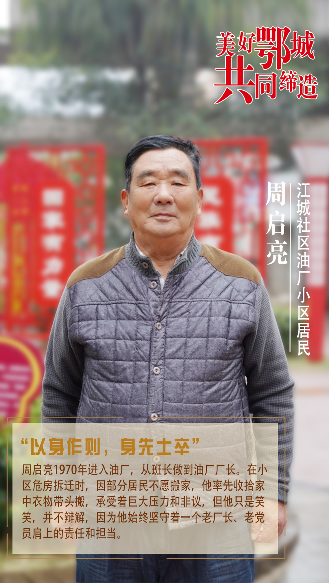 周啟亮1970年進(jìn)入油廠,從班長(zhǎng)做到油廠廠長(zhǎng)。在小區(qū)危房拆遷時(shí),因部分居民不愿搬家,他率先收拾家中衣物帶頭搬,承受著巨大壓力和非議,但他只是笑笑,并不辯解,因?yàn)樗冀K堅(jiān)守著一個(gè)老廠長(zhǎng)、老黨員肩上的責(zé)任和擔(dān)當(dāng)。