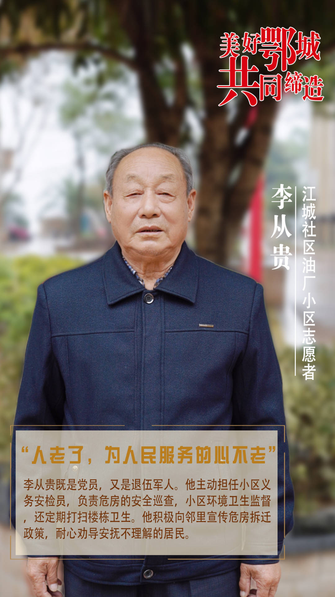李從貴既是黨員,又是退伍軍人。他主動(dòng)擔(dān)任小區(qū)義務(wù)安檢員,負(fù)責(zé)危房的安全巡查,小區(qū)環(huán)境衛(wèi)生監(jiān)督,還定期打掃樓棟衛(wèi)生。他積極向鄰里宣傳危房拆遷政策,耐心勸導(dǎo)安撫不理解的居民。