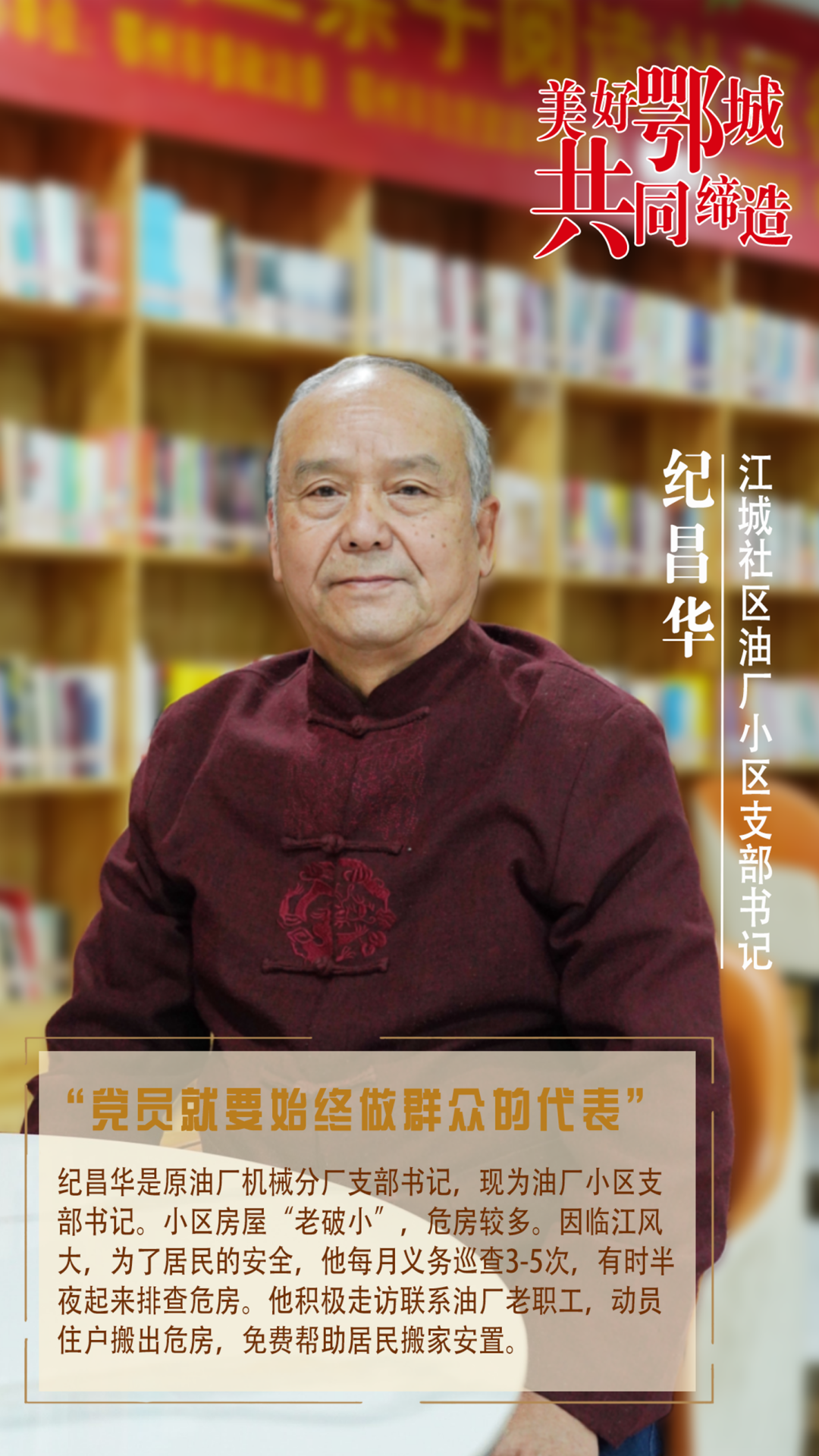 紀(jì)昌華是原油廠機(jī)械分廠支部書記,現(xiàn)為油廠小區(qū)支部書記。小區(qū)房屋“老破小”,危房較多。因臨江風(fēng)大,為了居民的安全,他每月義務(wù)巡查3-5次,有時(shí)半夜起來排查危房。他積極走訪聯(lián)系油廠老職工,動(dòng)員住戶搬出危房,免費(fèi)幫助居民搬家安置。