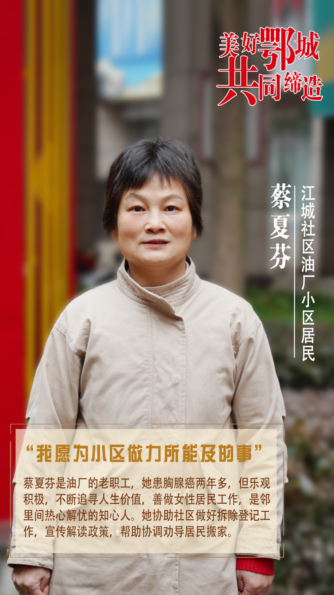 蔡夏芬是油廠的老職工,她患胸腺癌兩年多,但樂觀積極,不斷追尋人生價(jià)值,善做女性居民工作,是鄰里間熱心解憂的知心人。她協(xié)助社區(qū)做好拆除登記工作,宣傳解讀政策,幫助協(xié)調(diào)勸導(dǎo)居民搬家。