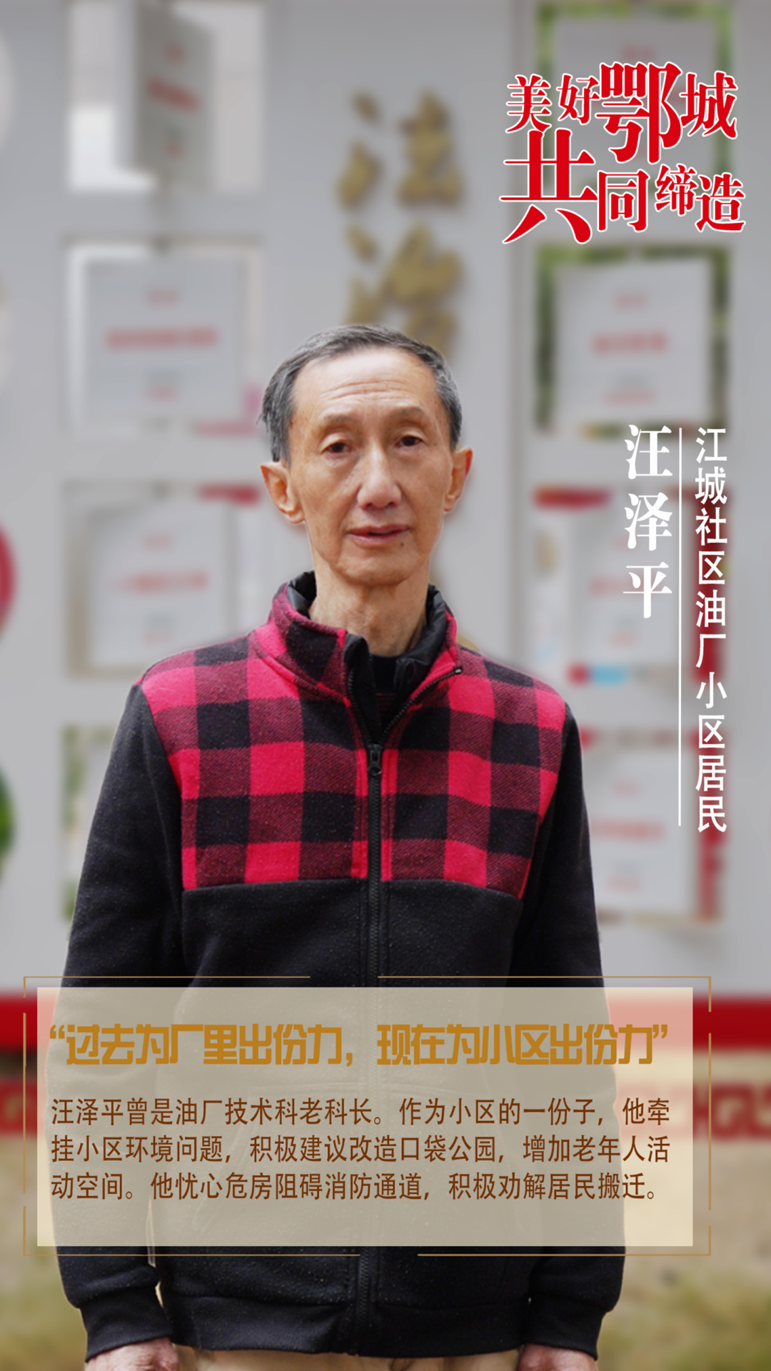 汪澤平曾是油廠技術(shù)科老科長(zhǎng)。作為小區(qū)的一份子,他牽掛小區(qū)環(huán)境問題,積極建議改造口袋公園,增加老年人活動(dòng)空間。他憂心危房阻礙消防通道,積極勸解居民搬遷。