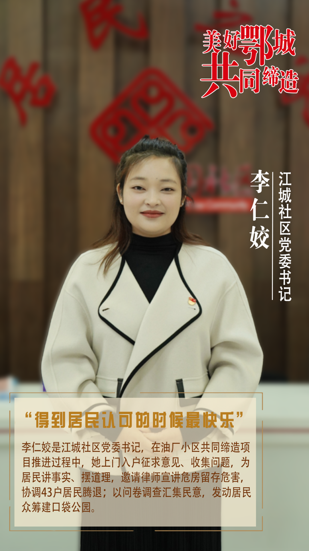 李仁姣是江城社區(qū)黨委書記,在油廠小區(qū)共同締造項(xiàng)目推進(jìn)過程中,她上門入戶征求意見、收集問題,為居民講事實(shí)、擺道理,邀請(qǐng)律師宣講危房留存危害,協(xié)調(diào)43戶居民騰退;以問卷調(diào)查匯集民意,發(fā)動(dòng)居民眾籌建口袋公園。