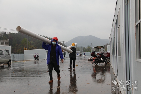 “雨又來(lái)了,管道這邊加人、加料,大家加把勁,今天必須完成所有排污管道的鋪設(shè)?!?1月29日上午6時(shí),崇陽(yáng)縣赤通公路旁備用集中隔離點(diǎn)項(xiàng)目建設(shè)現(xiàn)場(chǎng),跟雨點(diǎn)一樣急的是項(xiàng)目A區(qū)負(fù)責(zé)人劉華豪沙啞的嘶吼。