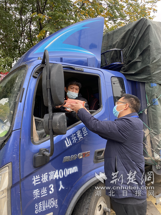 在博洛尼家居用品(湖北)有限公司門口,來自廣東佛山的貨車司機王師傅收到高新區(qū)黨群工作部疫情防控工作人員送上的“暖心包”,笑著豎起大拇指。