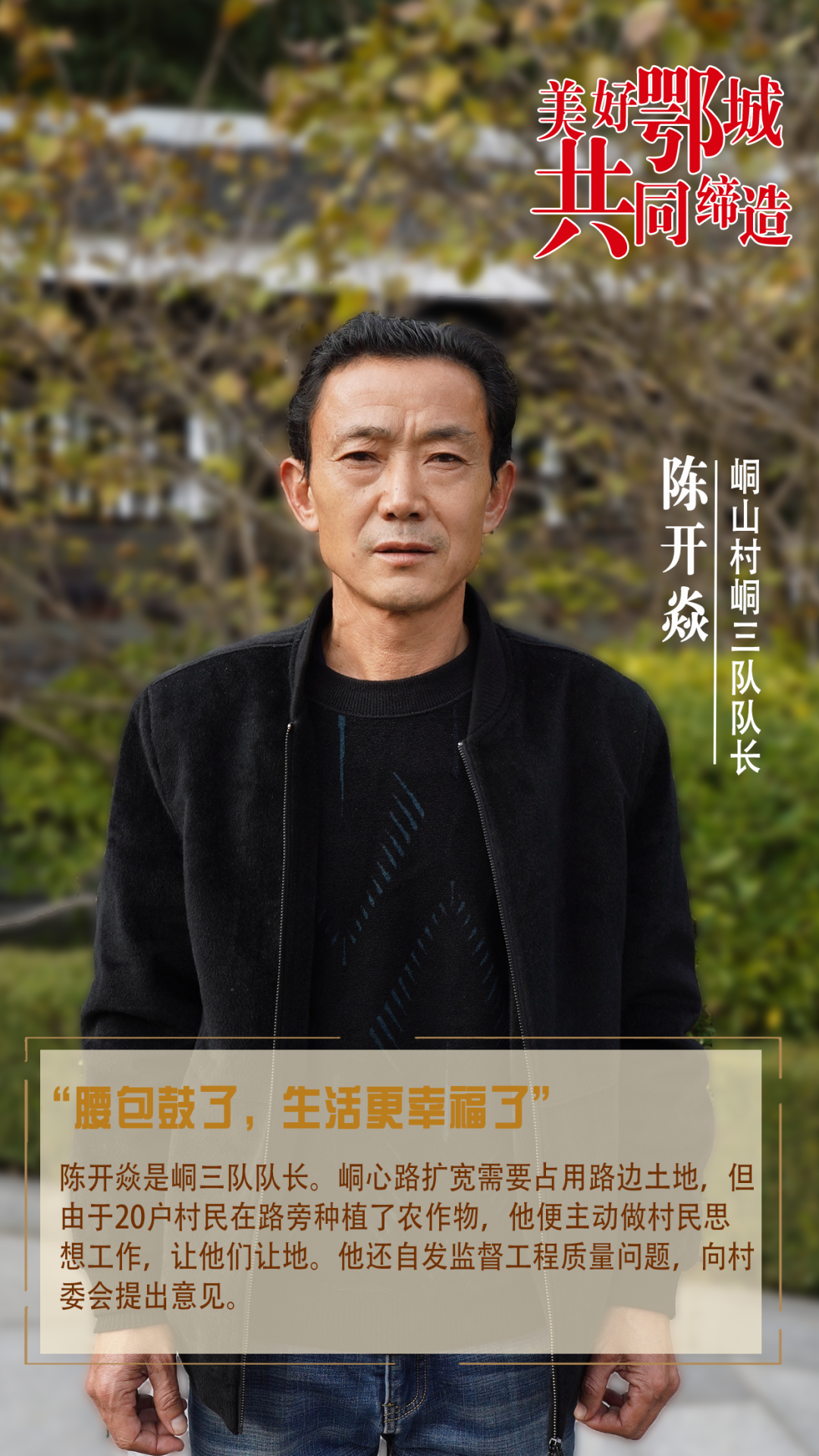 陳開(kāi)焱是峒三隊(duì)隊(duì)長(zhǎng)。峒心路擴(kuò)寬需要占用路邊土地,但由于20戶村民在路旁種植了農(nóng)作物,他便主動(dòng)做村民思想工作,讓他們讓地。他還自發(fā)監(jiān)督工程質(zhì)量問(wèn)題,向村委會(huì)提出意見(jiàn)。
