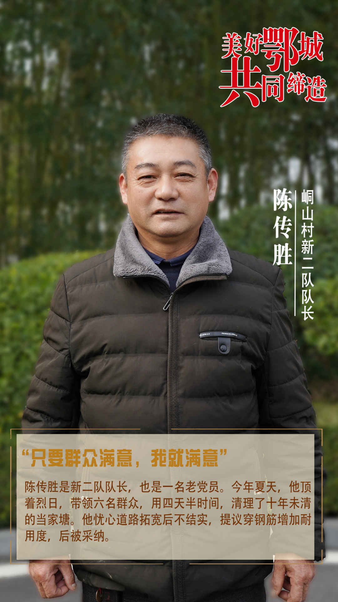 陳傳勝是新二隊(duì)隊(duì)長(zhǎng),也是一名老黨員。今年夏天,他頂著烈日,帶領(lǐng)六名群眾,用四天半時(shí)間,清理了十年未清的當(dāng)家塘。他憂心道路拓寬后不結(jié)實(shí),提議穿鋼筋增加耐用度,后被采納。