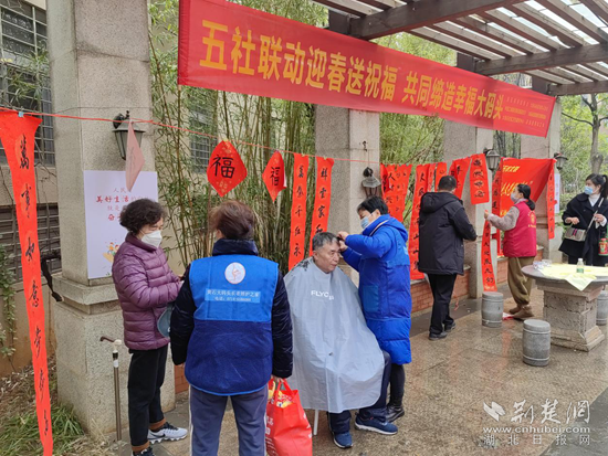 除了喜慶的春聯(lián),便民服務攤位也格外熱鬧。在現(xiàn)場志愿者及社工的引導下,社區(qū)老年協(xié)會志愿者現(xiàn)場為長者免費理發(fā),為轄區(qū)老年居民感受到了社區(qū)的關心和愛護。