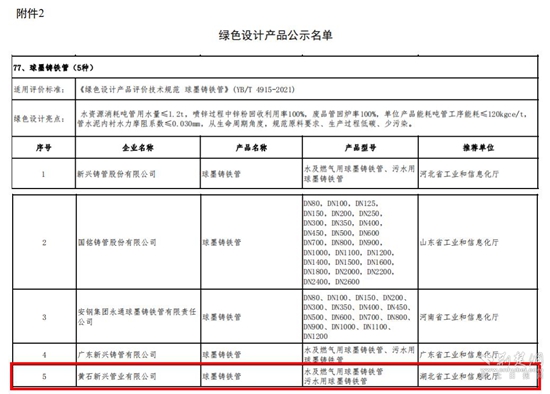 荊楚網(wǎng)(湖北日報網(wǎng))訊(通訊員 柯雪梅 尹建)2月9日,工信部發(fā)布《2022年度綠色制造名單公示》,經(jīng)黃石市和湖北省工信廳評審?fù)扑]及國家工信部專家評審,黃石新興管業(yè)有限公司球墨鑄鐵管產(chǎn)品榮獲綠色設(shè)計產(chǎn)品認定,意味著公司在綠色制造領(lǐng)域中取得了新突破。