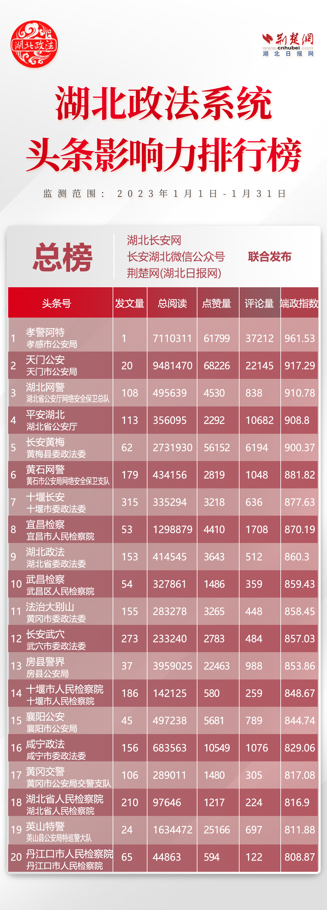 荊楚網(wǎng)(湖北日報(bào)網(wǎng))訊(記者胡小軍)2月13日,湖北省委政法委官網(wǎng)湖北長安網(wǎng)、官微長安湖北聯(lián)合荊楚網(wǎng)(湖北日報(bào)網(wǎng))、楚天輿情數(shù)據(jù)研究院發(fā)布湖北政法系統(tǒng)新媒體影響力排行1月榜單,黃岡政法系統(tǒng)多家單位入圍。