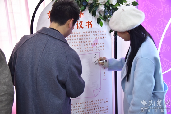 荊楚網(wǎng)(湖北日報網(wǎng))訊(通訊員 杜巧云、石姣、陳俊)“我承諾:抵制高價彩禮,為愛減負,拒絕低俗婚鬧,為愛守禮,主張婚事簡辦,為愛啟航,傳承優(yōu)秀文化,為愛踐行……”2月14日上午,大冶市婚姻登記處為當日上午登記領(lǐng)證的50對新人舉行“為愛減負,我承諾、我踐行”集體頒證活動,新人們在這個特殊的日子集體宣誓并在《婚俗改革倡議書》上簽字承諾。