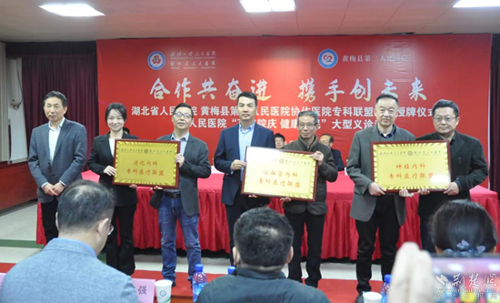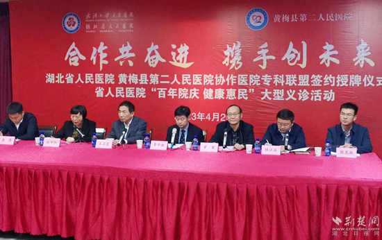 荊楚網(wǎng)(湖北日?qǐng)?bào)網(wǎng))訊(通訊員劉學(xué)平)4月23日,湖北省人民醫(yī)院和黃梅縣第二人民醫(yī)院(孔壟鎮(zhèn)衛(wèi)生院)協(xié)作醫(yī)院??坡?lián)盟簽約授牌暨省人民醫(yī)院“百年院慶 健康惠民”大型義診活動(dòng)在黃梅縣孔壟鎮(zhèn)舉行。