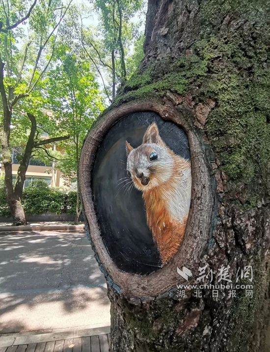 從溫泉谷到黨校入口處的山體雜草和垃圾已清理干凈,種上了耐陰的繡球花、彩葉草、網(wǎng)紋草等花草,展現(xiàn)出別樣風(fēng)情;街對面的道行樹上放上了仿真松鼠、貓頭鷹和桂花,樹洞橫截面“長滿”了松鼠、龍貓,淦河邊步道旁磚砌的窨井蓋因勢利導(dǎo),做成了樹樁的模樣,配上微塑蘑菇,幾可以假亂真;電箱穿上了風(fēng)景類的彩繪新衣……栩栩如生的小動物和與周圍環(huán)境渾然一體的彩繪,讓新升級的月亮灣網(wǎng)紅路“萌化”了!