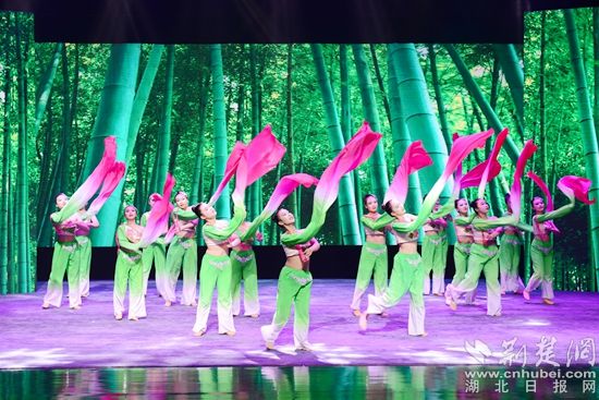 舞蹈《且吟春雨》《看了你一眼》婀娜曼妙,韻味十足。舞蹈《把愛寄回家》纏綿婉轉(zhuǎn),真情再現(xiàn)了一群留守兒童收到父母的快遞,思念父母的情景,表達(dá)留守兒童的心聲和期盼,呼吁社會(huì)給予他們更多的關(guān)愛。舞蹈《楚鼓聲聲》鏗鏘有力,再現(xiàn)了泱泱大國威武雄風(fēng)。
