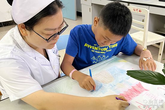 “這幅畫(huà)送給黃醫(yī)生?!毙∶饕?yàn)橹夤苎捉邮芰艘恢艿淖≡褐委?,他在兒科病房?jī)?nèi)用顏料、紙張和畫(huà)筆,畫(huà)了自己和兒科主任黃佳林主任的合照,準(zhǔn)備在出院時(shí)送給醫(yī)生。