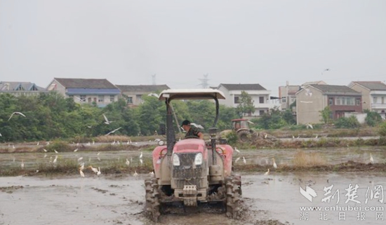 水田中,打田機來回穿梭,工人們在忙著灌水、播種,到處都是一片生機勃勃的繁忙景象。一群群白鷺鳥在人與機器之間飛來飛去嬉耍,織就出一幅喜樂祥和的圖畫。