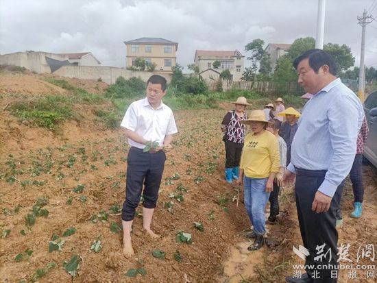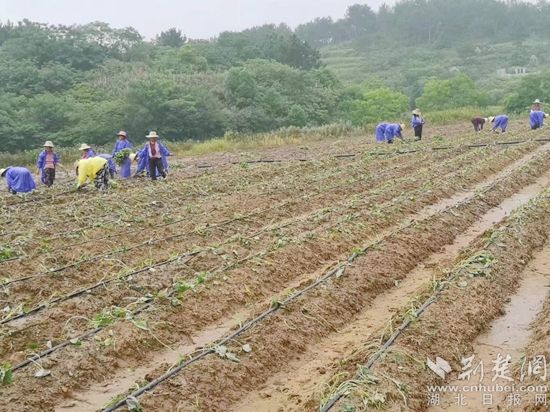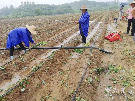 荊楚網(wǎng)(湖北日?qǐng)?bào)網(wǎng))訊(通訊員毛紅平)6月25日,天空下著蒙蒙細(xì)雨,紅安縣永佳河鎮(zhèn)沙河村帥家河塆河畈地1000畝連片基地上,150多位村民正穿著雨衣,飛快地?fù)屧约t苕苗。