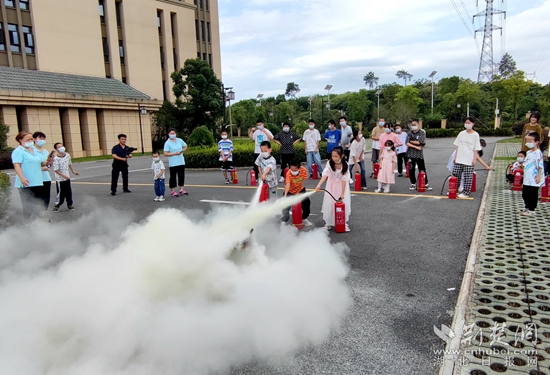 演練時,消防宣傳員組織院內(nèi)兒童在樓內(nèi)的活動空間及逃生通道進行疏散演練。所有人牢記彎腰、低頭、捂住口鼻三大要點,沉著應(yīng)對,迅速從安全通道撤離到廣場。隨后,在廣場上所有兒童按照消防宣傳員教授的方法:提、拉、握、壓四個步驟,正確使用滅火器進行滅火演練。